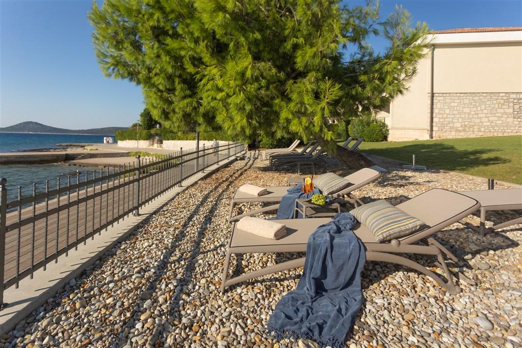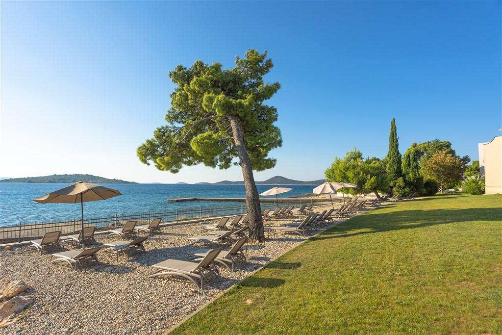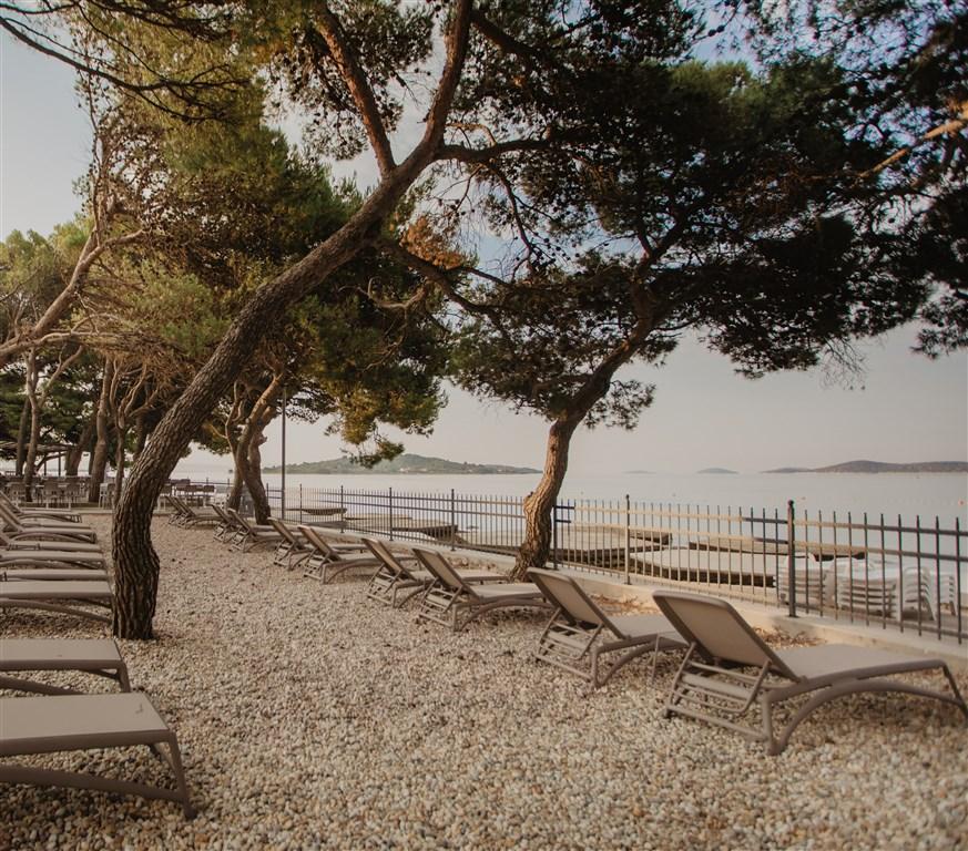 Oblázková, místy kamenitá, asi 50-100 m od hotelu. |